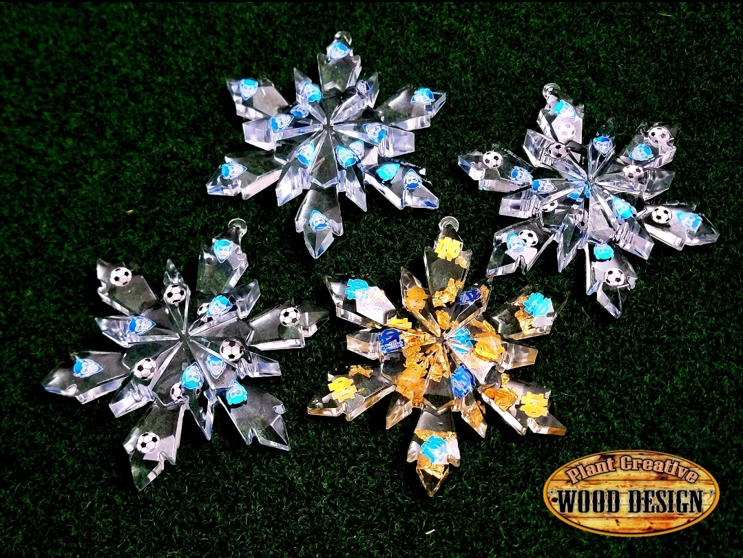 Other notes or personalization4.5" epoxy snowflakes with custom engraved/cut metal QND logos and sport ball (put into comments which one) inside of the snowflake cut from thin metal. If only want QND logo, type into comment section "NO SPORT". ONE OF A KIND